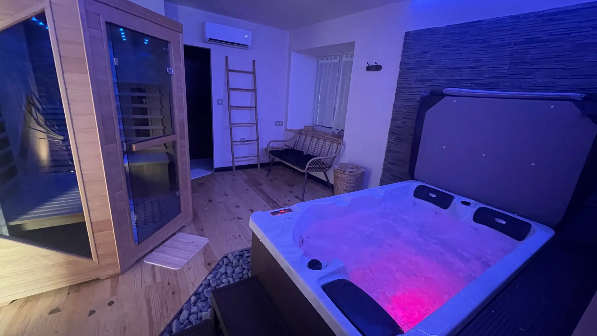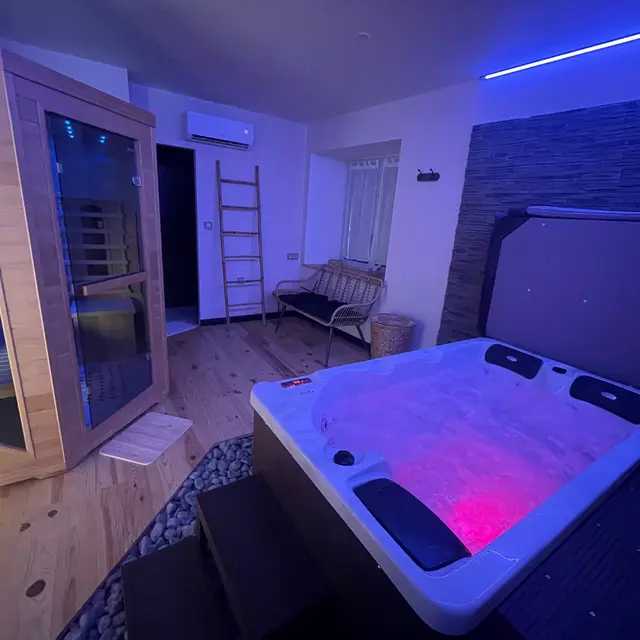 Loveroom spacieuse avec espace bien être au rez-de-chaussée : sauna, hammam et spa.