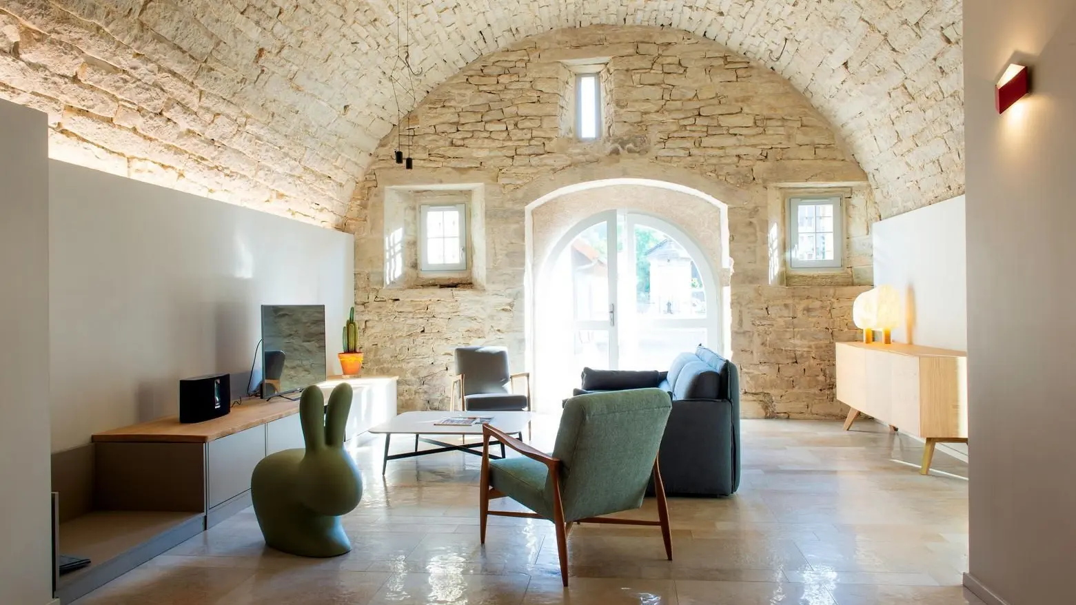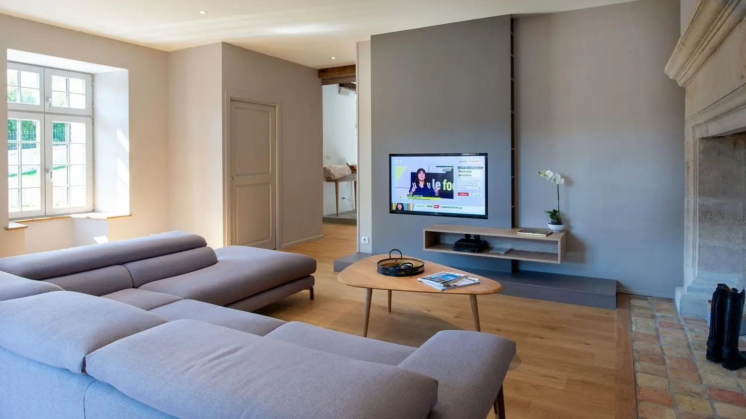 Au rez-de-chaussée: magnifique salon (canapé lit convertible pour un couchage supplémentaire) avec espace cuisine en pierres apparentes et plafond voûté, cheminée, cave à vins. Le majestueux escalier en colimaçon, en pierres de taille, donne accès au premier étage: deuxième cuisine équipée, avec une cheminée d'époque et un subtil mariage de style scandinave, spacieux salon épuré, tout en luminosité. Au deuxième étage, 3 chambres: 2 chambres avec lits doubles, 1 chambre 3 personnes (1 lit double, 1 lit simple) avec salle d'eau privative. Une deuxième salle d'eau.