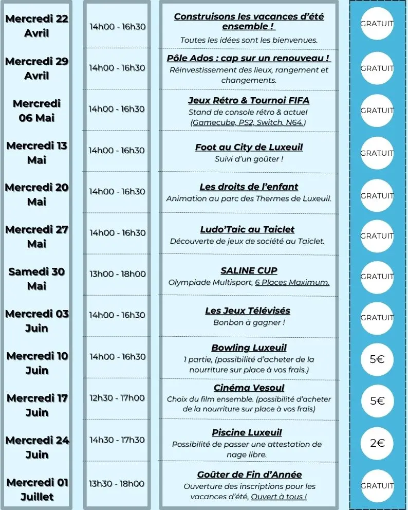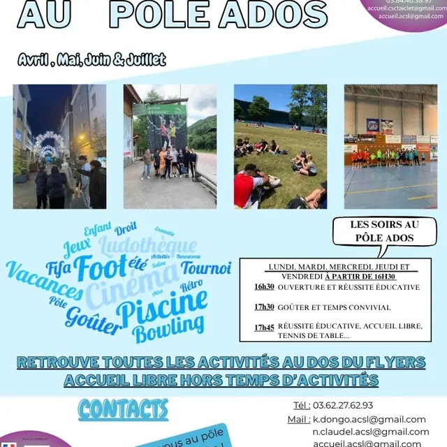 Programme d'activités riches et sportif pour les mercredis au Pôle Ados, du 22 avril au 1er juillet 2026. Renseignements et inscriptions dans les accueils des centres sociaux ou par téléphone au 03.84.40.38.97 ou 03.84.40.56.55.